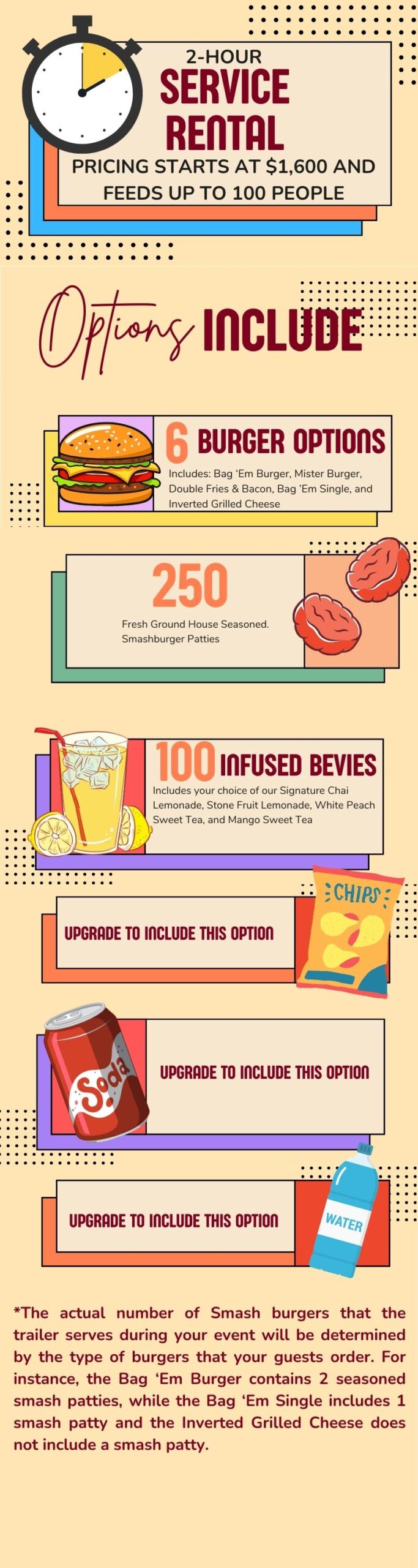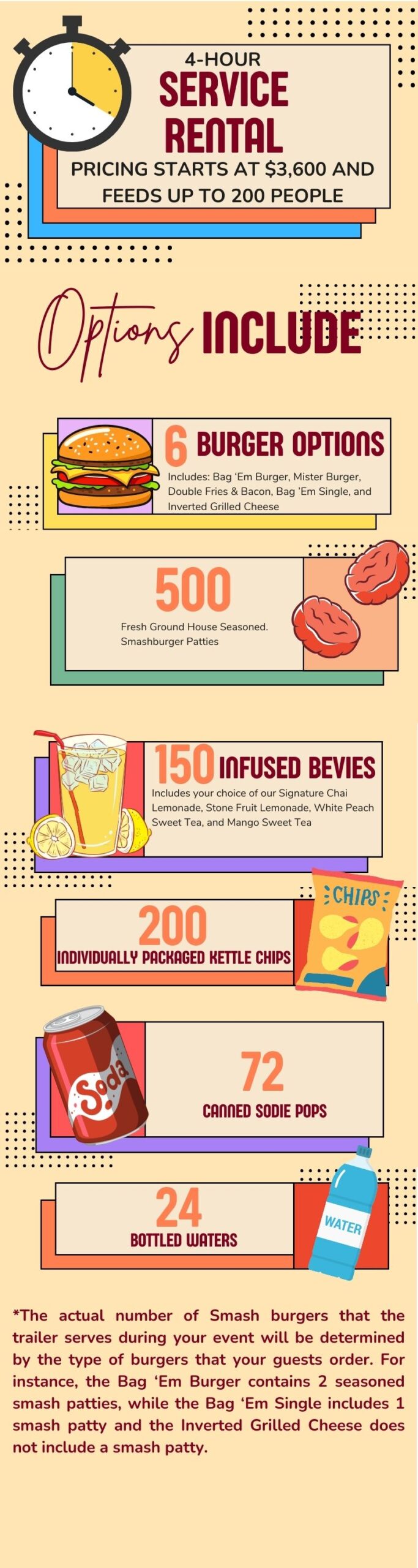 The brief explanation is that when conceptualizing the Bag ‘Em Food Trailer, we anticipated limited space. However, we successfully incorporated your favorite Bag ‘Em Burgers and Infused Bevies, along with a tasty alternative: individually bagged, lightly salted kettle potato chips.